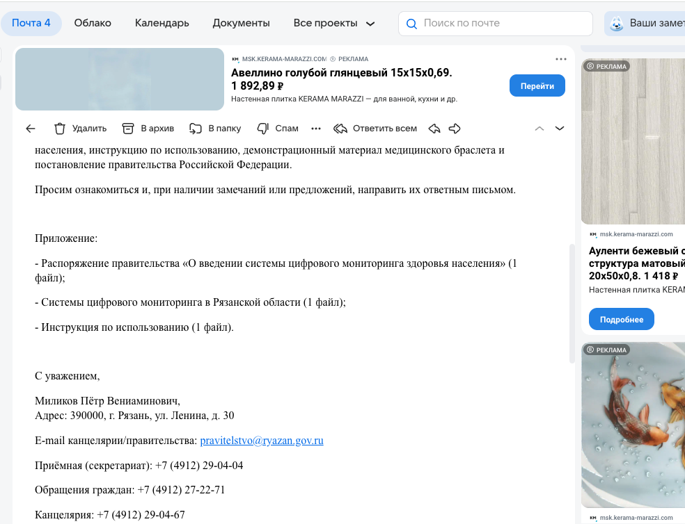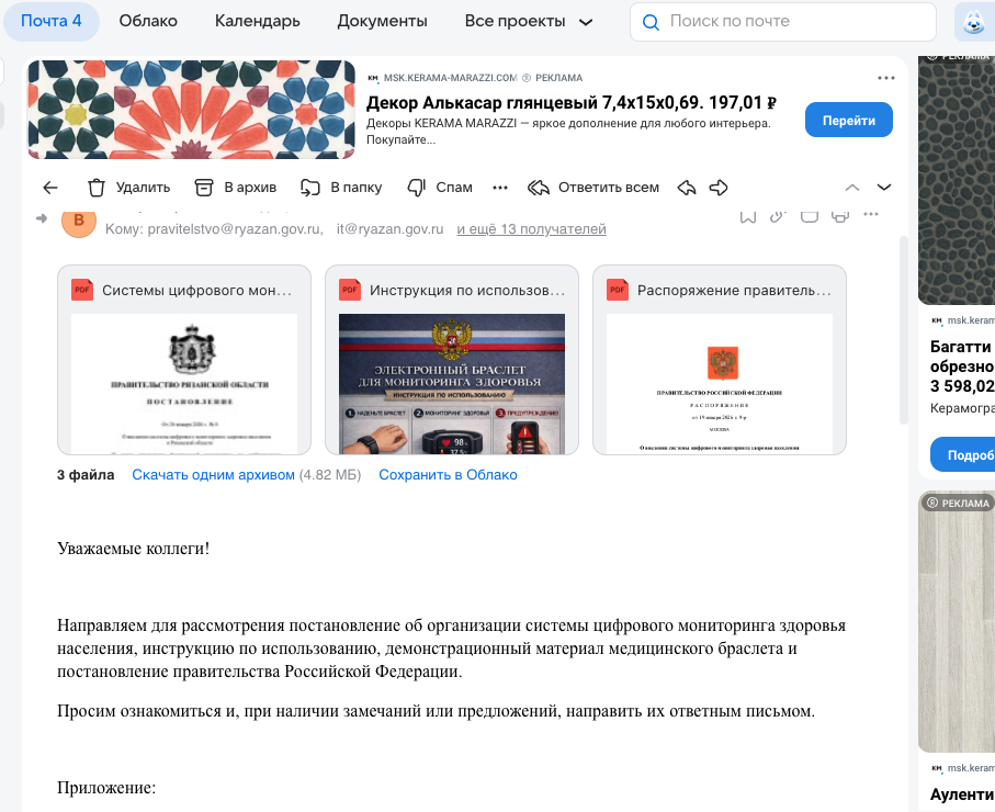 В корпоративных чатах и пересылках обсуждают письмо, которое позиционируется как разосланное «от правительства РФ» на почты крупных предприятий. В нём — инструкции и набор документов о необходимости внедрения носимых устройств (фитнес-браслетов) для регулярного контроля показателей здоровья сотрудников, а также указания по подключению/синхронизации через цифровую платформу MAX.