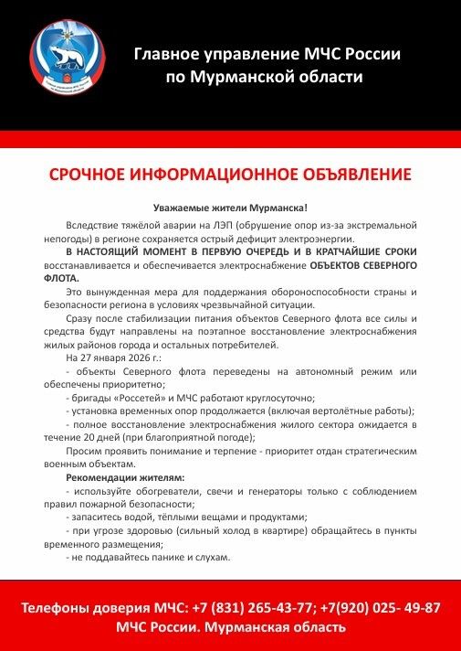 Без электричества остались Мурманск, Североморск и поселки — база Северного флота. Отопление отключилось, температура в квартирах упала до критической, троллейбусы встали. Жители в соцсетях пишут: «Как в блокаде — раздают тушёнку и хлеб, но дети мёрзнут без горячей еды и света».