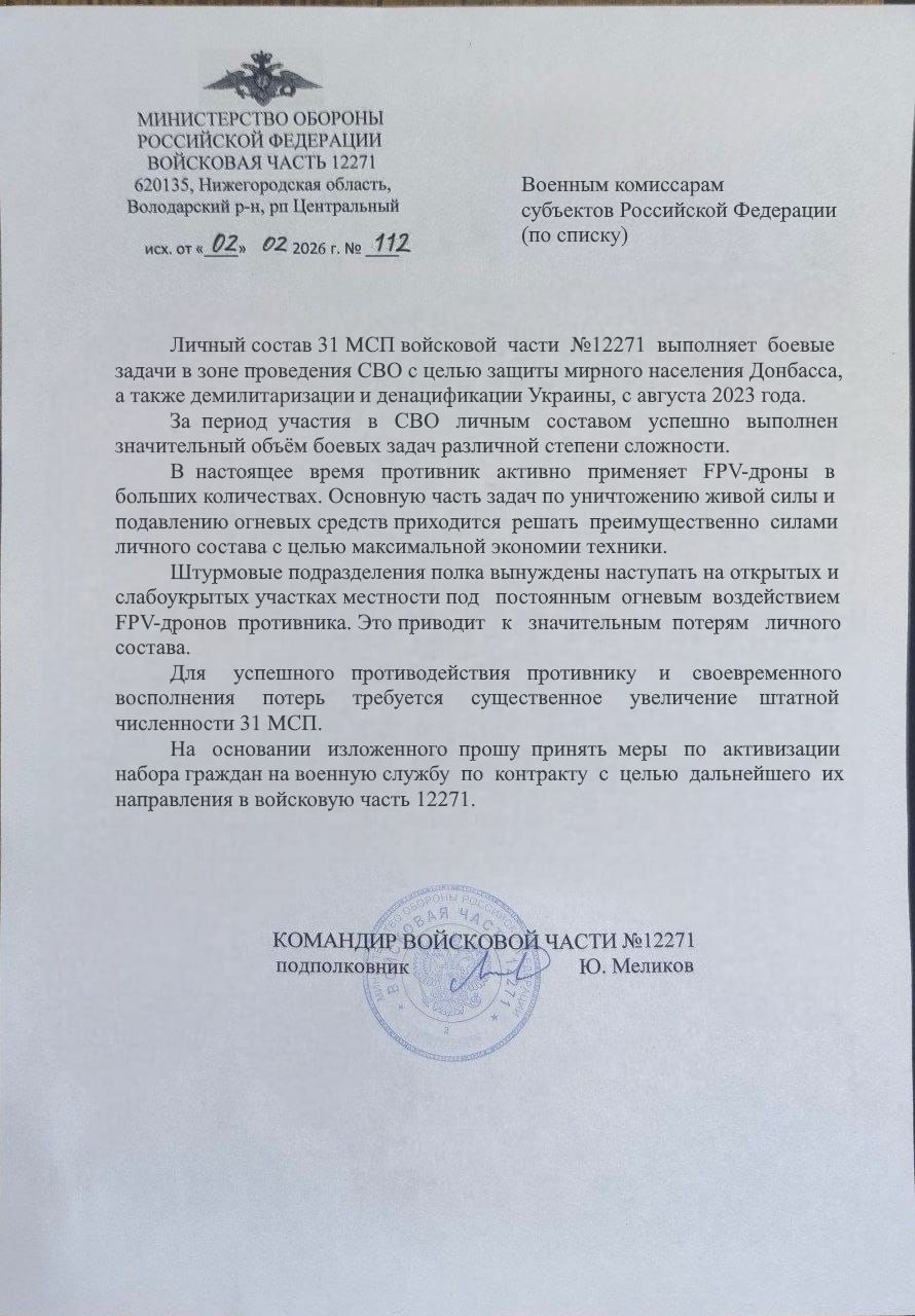 2 февраля 2026 года, воинская часть 12271 (31-й мотострелковый полк, в/ч 12271, Нижегородская область). Командир части подполковник Ю.Меликов направляет официальное письмо военным комиссарам. В нём сухая, страшная правда: «Противник активно применяет FPV-дроны в больших количествах. Основную часть задач по уничтожению живой силы и подавлению огневых средств приходится решать преимущественно силами личного состава с целью максимальной экономии техники. Это приводит к значительным потерям личного состава. Для успешного противодействия… требуется существенное увеличение штатной численности 31 МСП».